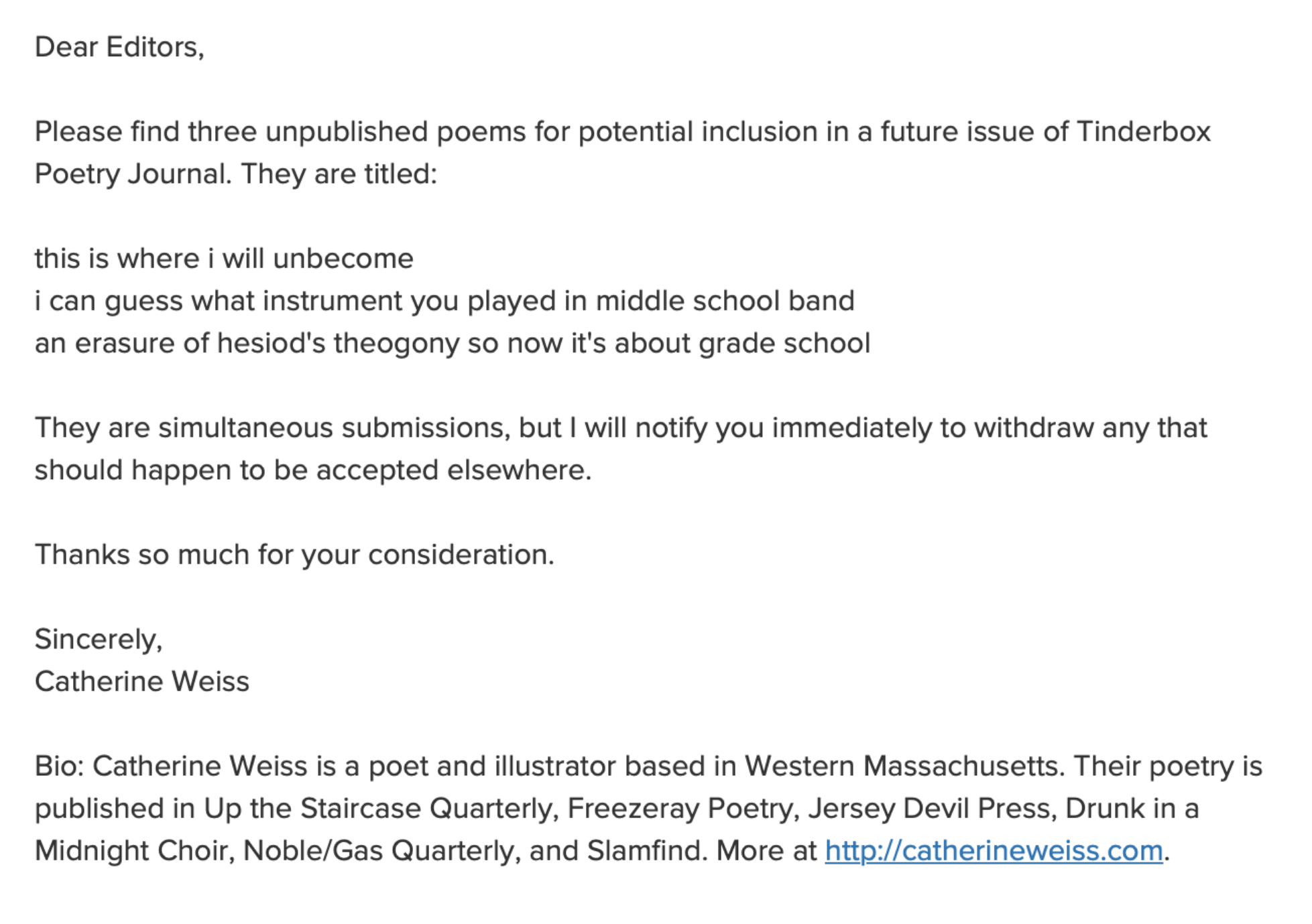 • Introduction. Include a sentence to say what you’re doing. I say how many poems I’m submitting, and I include the name of the journal here. If it’s a contest, or submitting to a specific issue or theme, I say that here. I sneak in the fact that they’re unpublished (which they usually are; most journals don’t publish reprints), which I do just to build confidence I know how this all works.