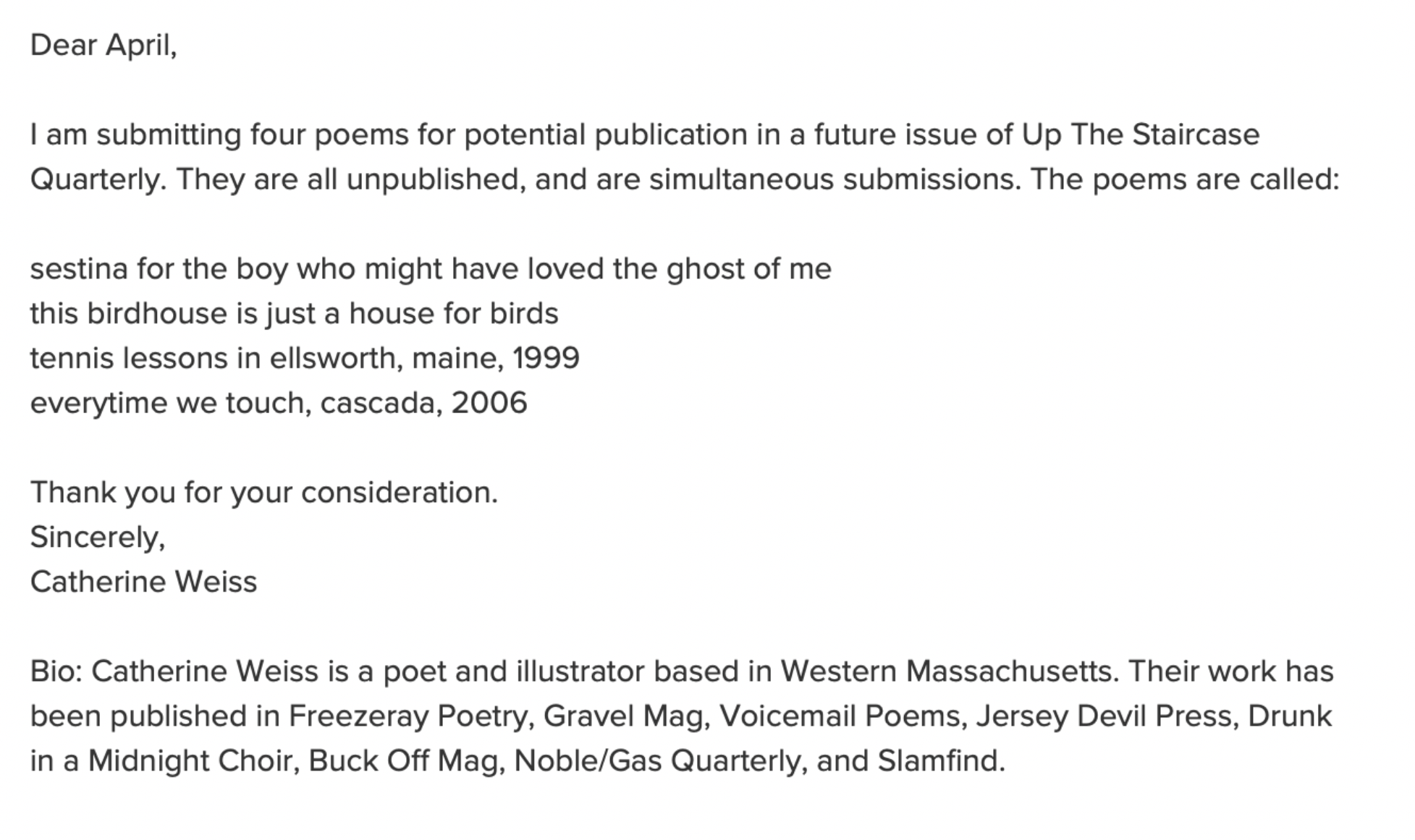 • Addressing the cover letter. You want to ideally address a cover letter either to 1-2 people by name. You figure out who that might be by going to the website and looking at the masthead page. This is the list of who works at the magazine/journal. Some journals are only run by 1-2 people, some list a hierarchy of people. If there aren’t jobs listed but only 1 or 2 people listed, use their name. Unless I know them personally, I use “Dear [First Name]” as opposed to something more informal, like “Hi”. If there are more than a couple of people working there, address your letter to the Poetry Editor. Sometimes the website will say whom to address the letter to, which of course, you should do as instructed. If you can’t figure out from the website who to address your letter to, do as I did in the 1st example, and address the letter “Dear Editors”. That’s usually fine anyway.